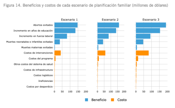 En planificación familiar una inversión de USD 53.2 millones para incrementar el uso de anticonceptivos modernos (escenario 1) evitaría 68,253 abortos, 18,664 embarazos, 10 muertes maternas y 90 muertes neonatales.